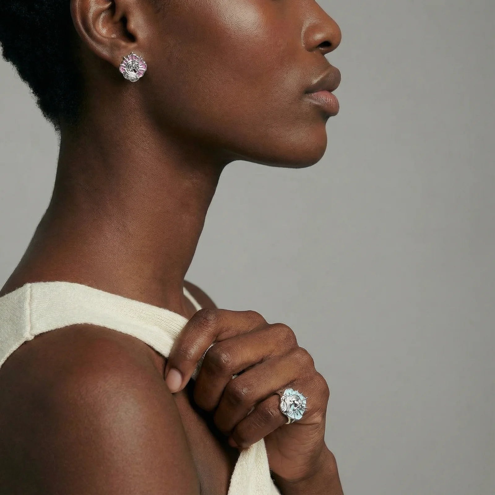 White gold-plated unicorn silhouettes dance around aqua and magenta stones in these enchanted studs that absolutely scream fairytale energy.